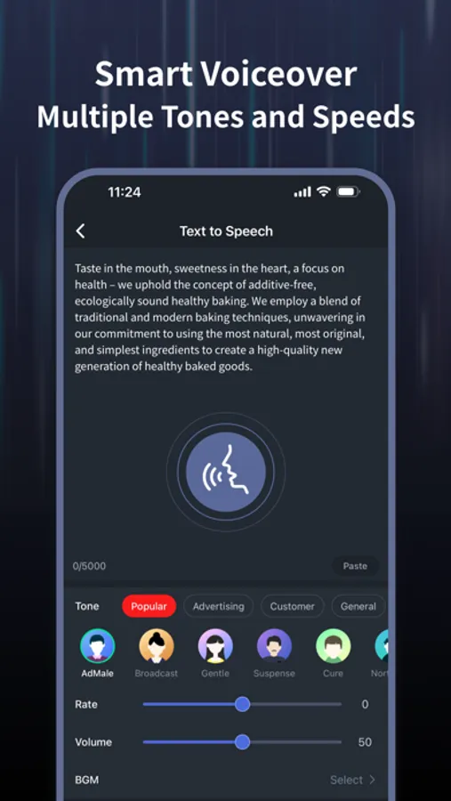 -Text-to-speech conversion, featuring an intelligent voiceover tool with various selectable voices.