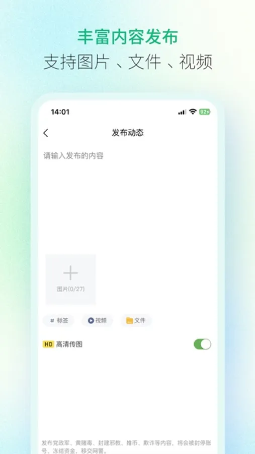 【资料管理】个人、博主、圈主可以通过纷传圈子发布文字、图片、视频、音频、pdf、表格、txt等多种内容形式,支持图文等资料多图、混合排布。