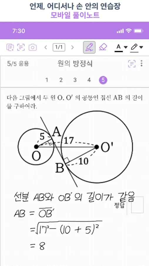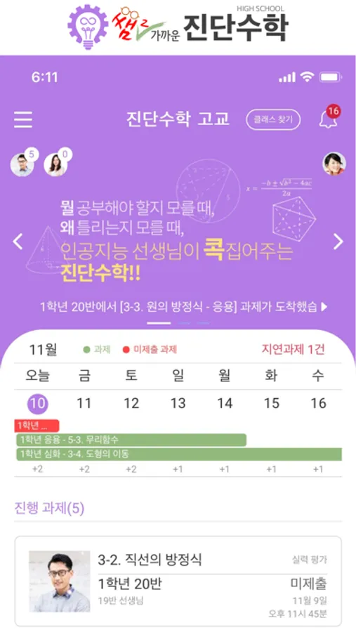 교사용 앱에서 담당 교사가 개설한 클래스에 가입하면 선생님이 내준 과제를 풀이할 수 있습니다. 풀이를 완료하면 담당 교사는 나의 풀이 과정과 진단 결과를 볼 수 있고, 그 결과를 참고하여 앞으로의 지도 방향 결정에 도움을 줍니다.