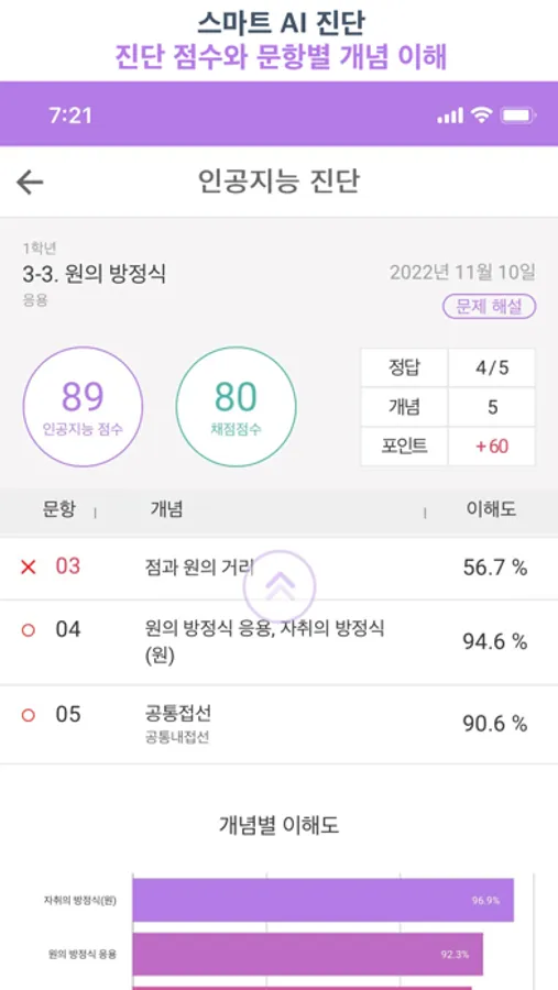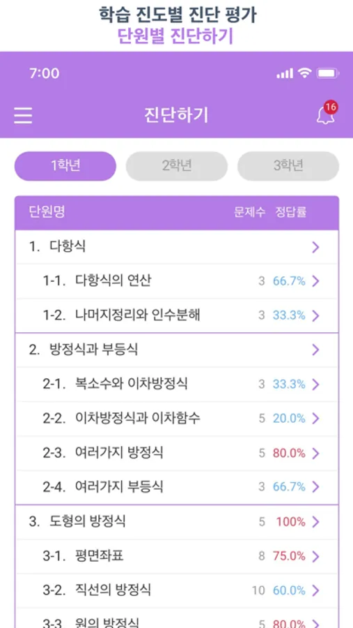 소단원 또는 대단원별 진단평가에 응시할 수 있으며, 풀이 결과를 인공지능이 분석하여 나의 진짜 실력과 취약개념을 쉽게 파악할 수 있습니다.