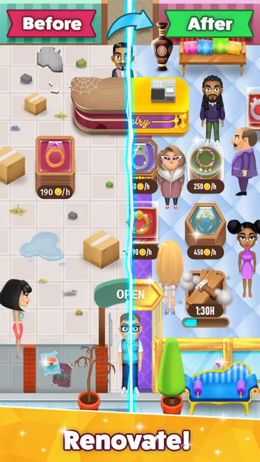 MANAGE YOUR SHOP! When you’re done crafting, it’s time to sell. Take on the role of a shop manager. Manage the store, build cabinets to display jewelry and sell it to your clients in this free game. Not only is it crucial to have the right strategy, but also taste. Your building is in ruin at first, but you can upgrade it! After upgrading the building you can also customize it the way you like. Golden entrance? Gems decorations? Red carpet? Your choice! You can manage and upgrade your store the way you like it. The more you upgrade, the more clients will come to shop. All fashionable and demanding, can you satisfy them with your jewelry? Find you in this free game!