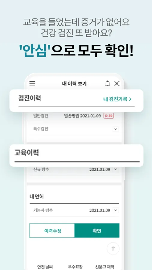 근로자에게는 프로필 관리를 통해 중복 교육과 건강 검진을 최소화할 수 있도록 관리해 드리고, 관리자들에게는 오늘 내 현장의 위험 요인을 빠르고 정확하게 파악할 수 있는 서비스 제공 및 현장 전체의 안전 데이터를 자동으로 기록해 드립니다. 안심은 Digital기반 안전 경영의 표준 모델을 지향합니다.