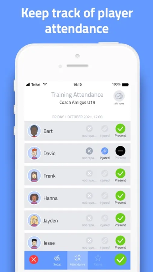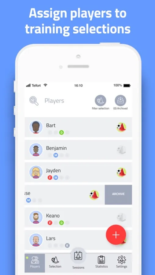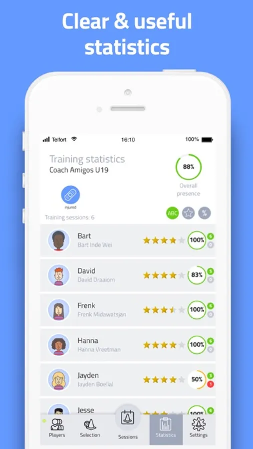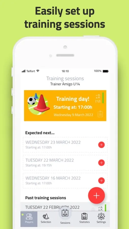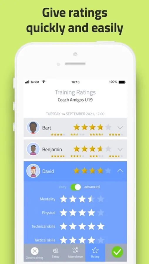 Easily start managing and tracking all your training sessions. Thanks to an inventive and clear rating system, you can monitor the development of your players. Create multiple training selections and easily schedule training sessions with the unique preview function.