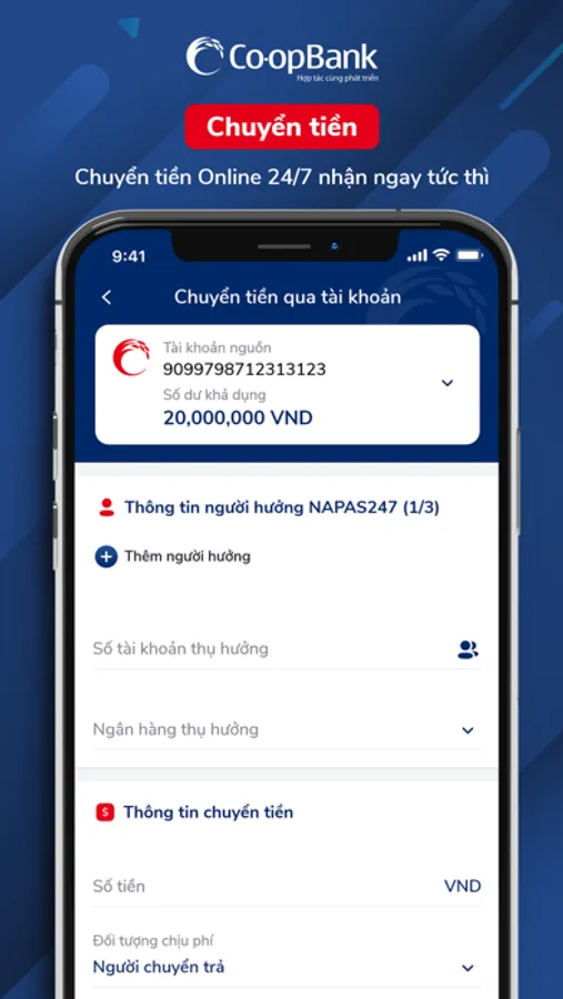 * Chuyển khoản: chuyển tiền trong Co-opBank, Chuyển tiền nhanh 24/7, Chuyển tiền qua Giấy tờ tùy thân;