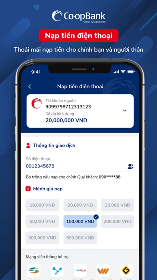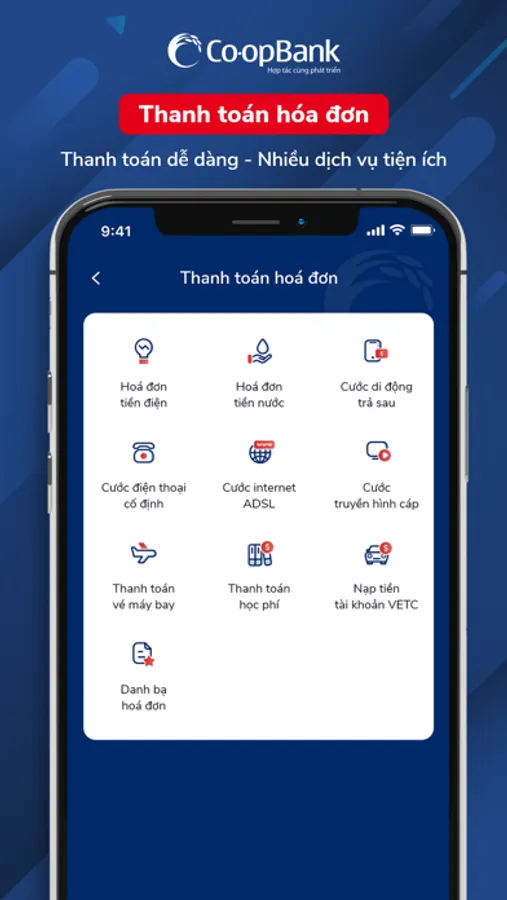 Co-opBank Mobile Banking là ứng dụng do Co-opBank phối hợp với Công ty Cổ phần Giải pháp Thanh toán Việt Nam (VNPAY) phát triển nhằm cung cấp cho khách hàng các dịch vụ ngân hàng nhanh chóng, an toàn và tiện lợi.
