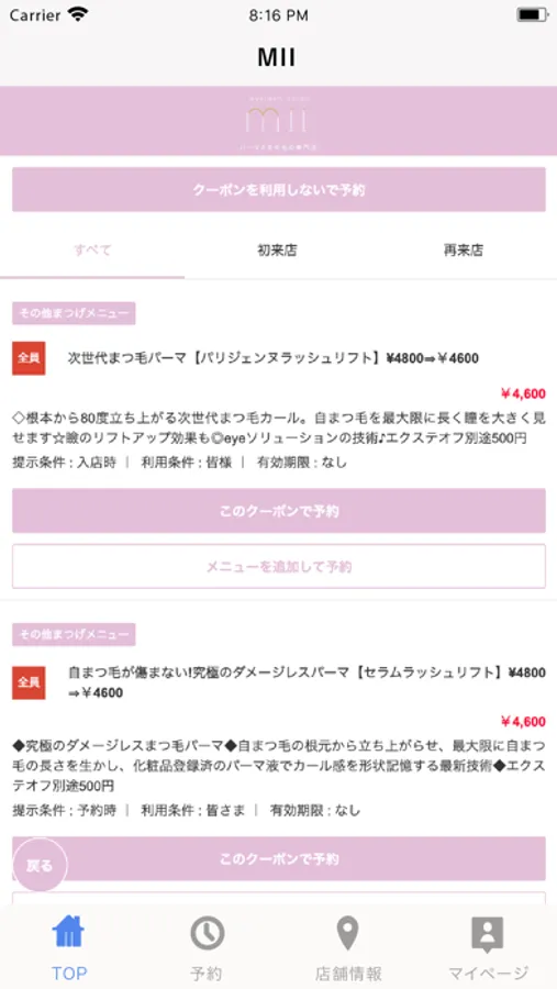お得なクーポンが配信されます。ネット予約時にクーポン利用での予約も可能なので来店時もスムーズに施術頂けます。