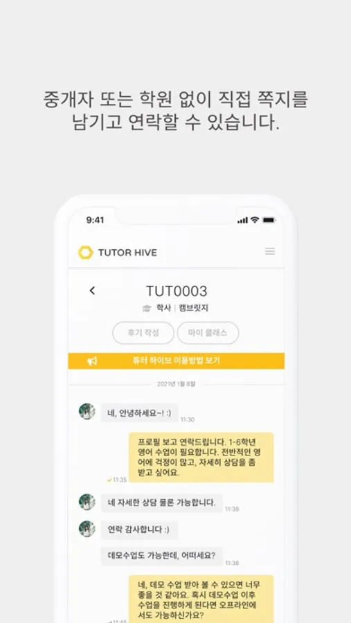 중개자(상담원, 학원) 개입없이 쪽지를 통해 튜터와 학생이 다이렉트로 서로 연락할 수 있습니다.