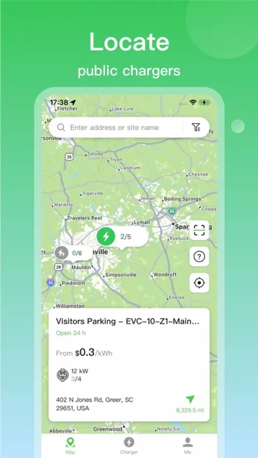 • Displays the availability status of public chargers on the map. (available, in-use, out of order, etc.)