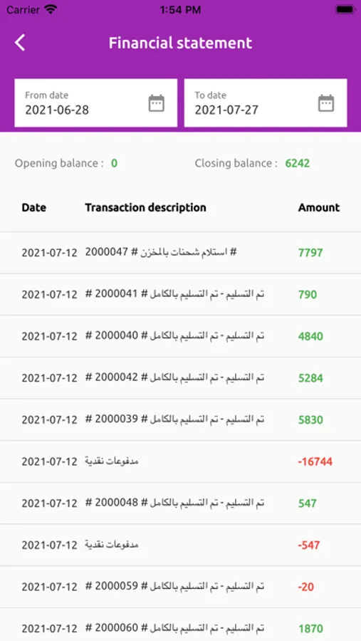 • كشف حساب العميل به تفاصيل المعاملات المالية