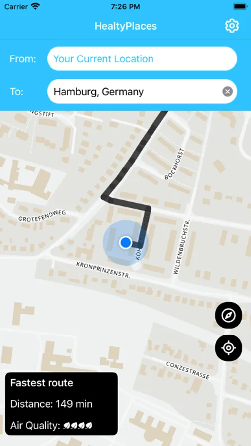 Find the healthiest route recommendation to your destination. The app gives you step-by-step instructions like any other navigation application