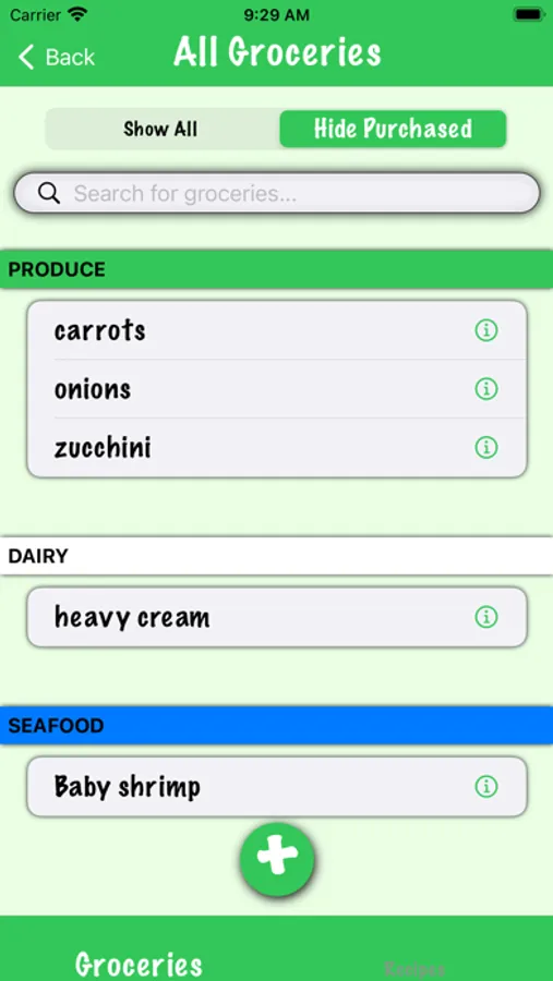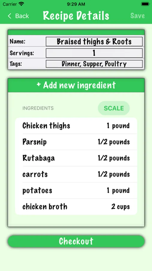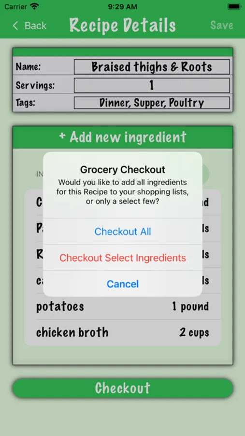 The first time you make a recipe, it's often easy to add all ingredients to your shopping lists. However, the second or third time it's easy to forget an ingredient (or three). That's where iGetGroceries comes in handy. Anytime you would like to go shopping for a recipe, just tap 'Checkout' on the recipe to add all of its ingredients to their respective shopping lists.