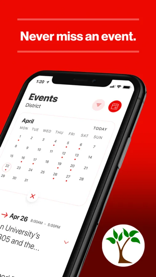 The event section shows a list of events throughout the district. Users can add an event to their calendar to share the event with friends and family with one tap.