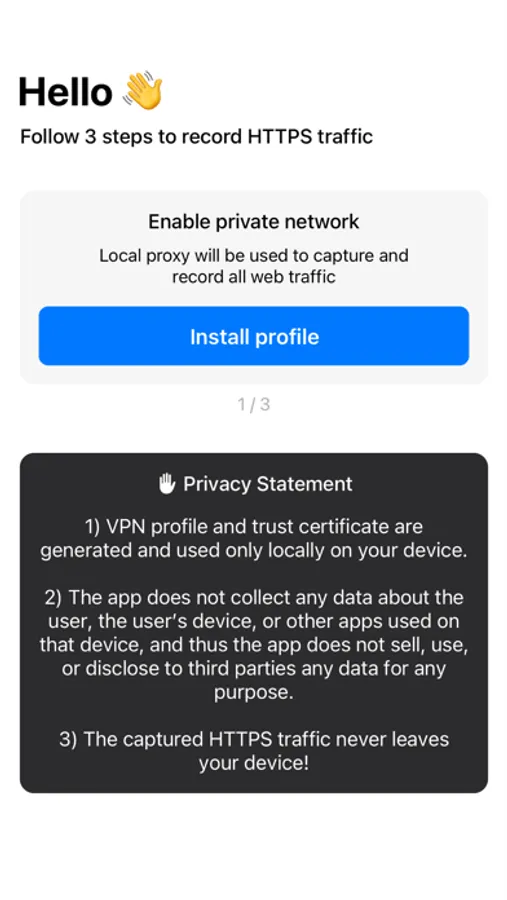The app creates a local on-device server and routes all outgoing HTTPS traffic through it. The app locally generates a trust certificate that should be installed and trusted to securely decrypt HTTPS traffic. When it is done, WebProxyTool captures HTTPS requests, makes dummy leaf certificates for requested domains, and acts as a man-in-the-middle proxy to read network data. Importantly, data is stored only in a local device database, ensuring user privacy, and WebProxyTool developers do not have access to it. The app works without any remote servers involved.