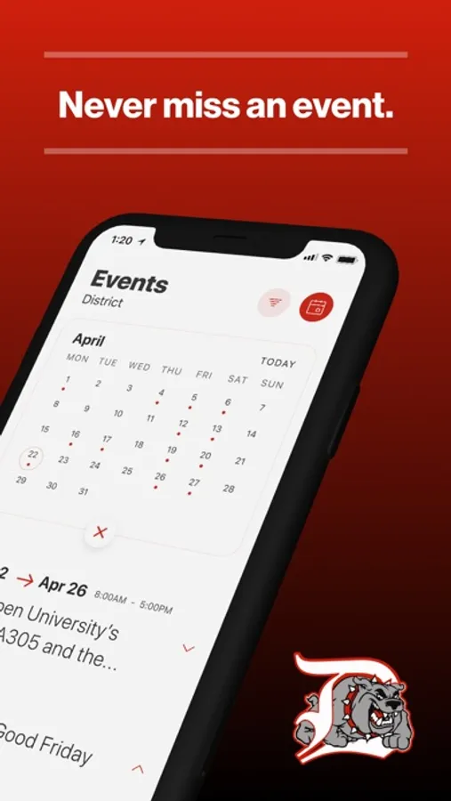 The event section shows a list of events throughout the district. Users can add an event to your calendar to share the event with friends and family with one tap.