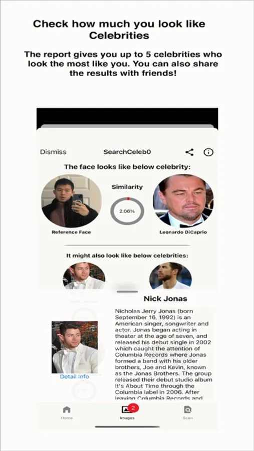 • Celebrities you look like the most: It provides face comparison recognition to check which celebrities you look like the most! It is able to compare the face in your image with currently popular celebrities and tell you the results with suggestion of 5 celebrities in total.