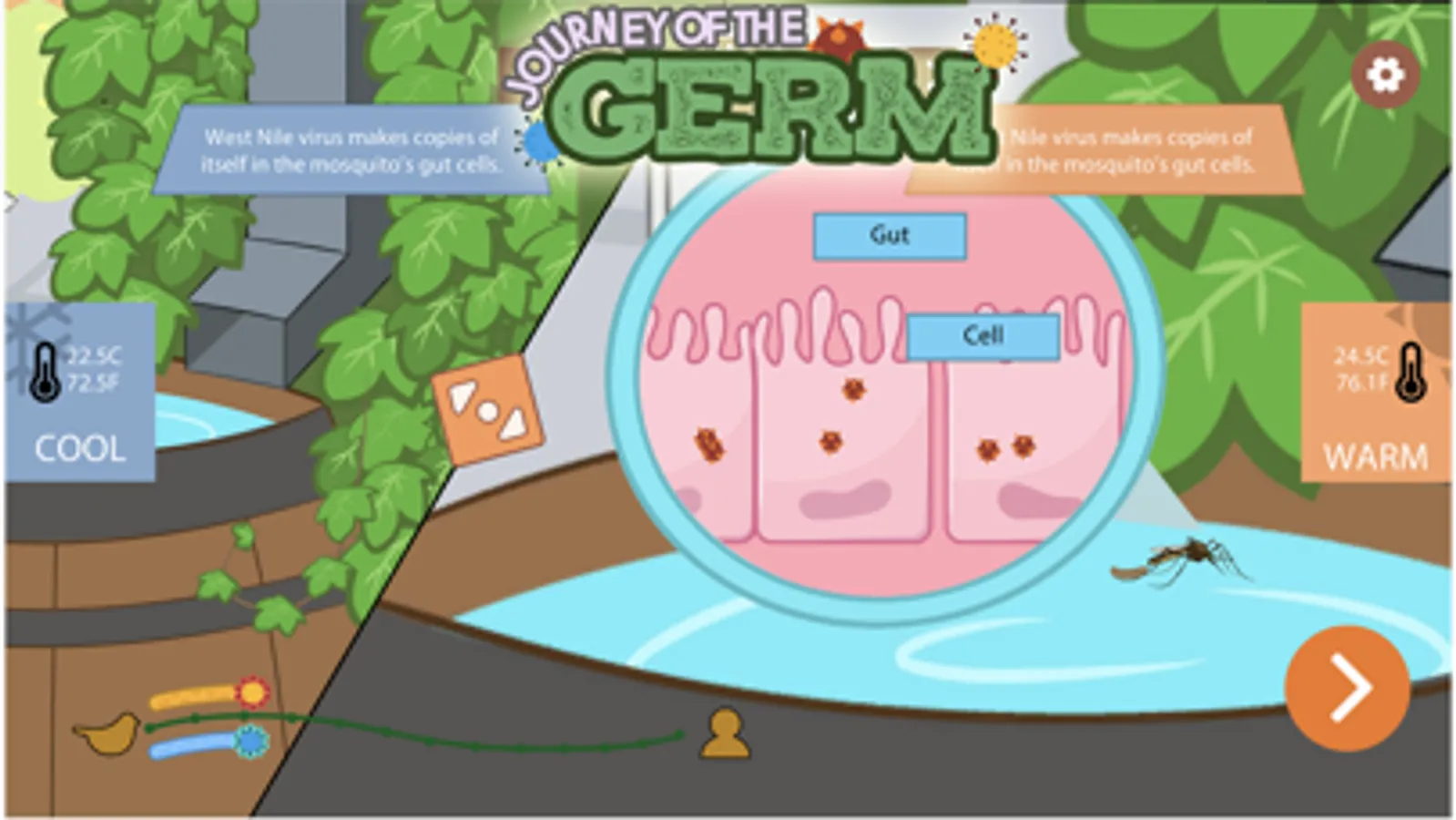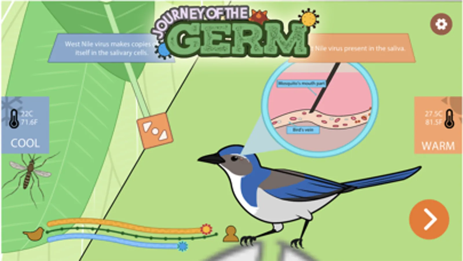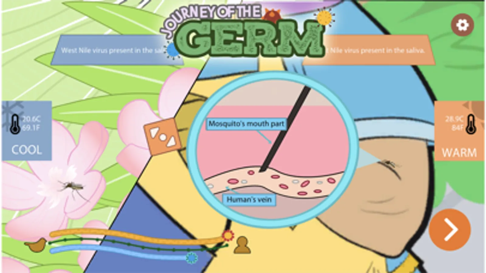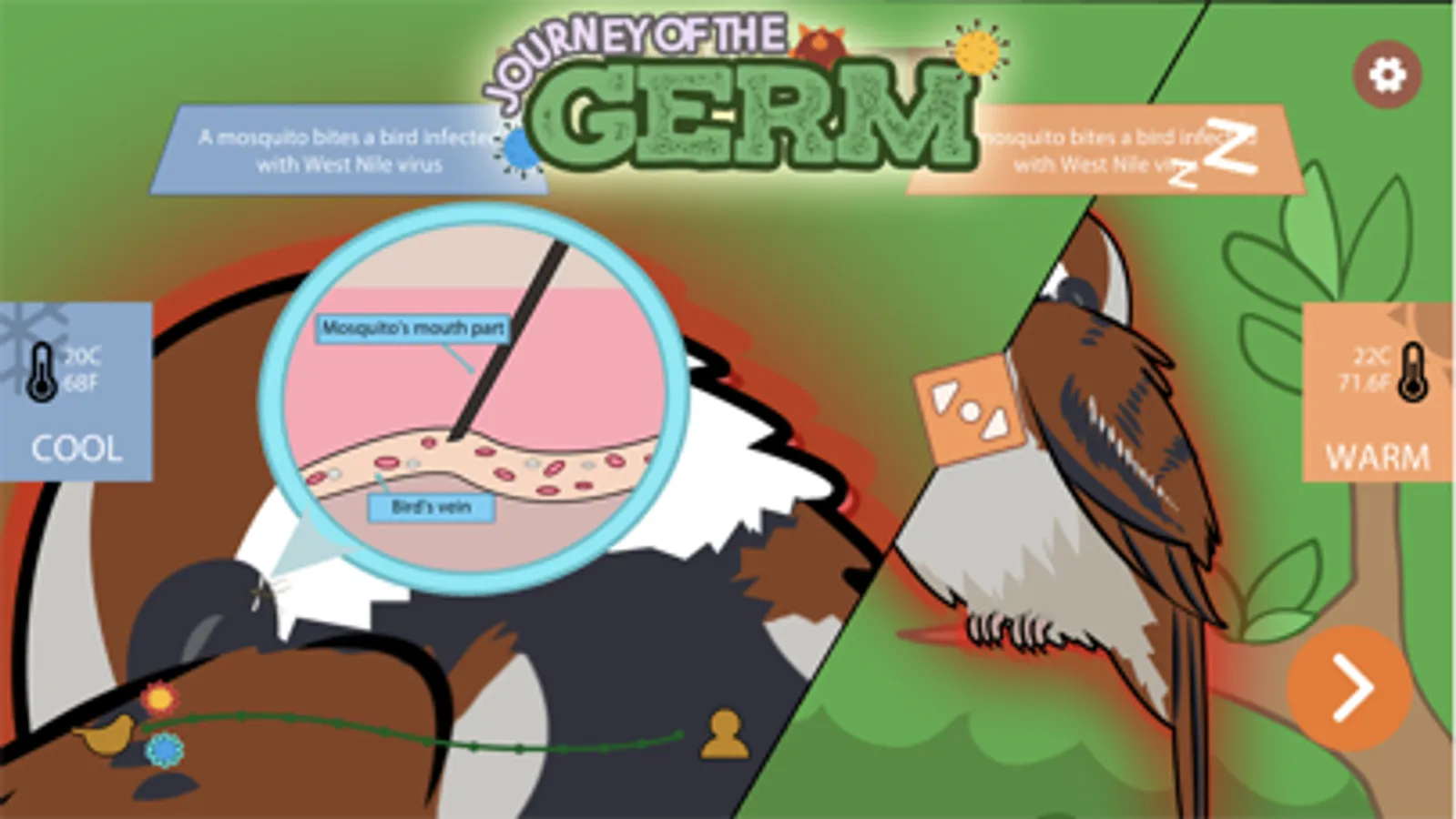 Journey of the Germ is an animated and interactive video that details how West Nile virus is spread from host to host by a mosquito. The experience illustrates the surprising difference a few degrees in temperature can make in the spread of West Nile virus.