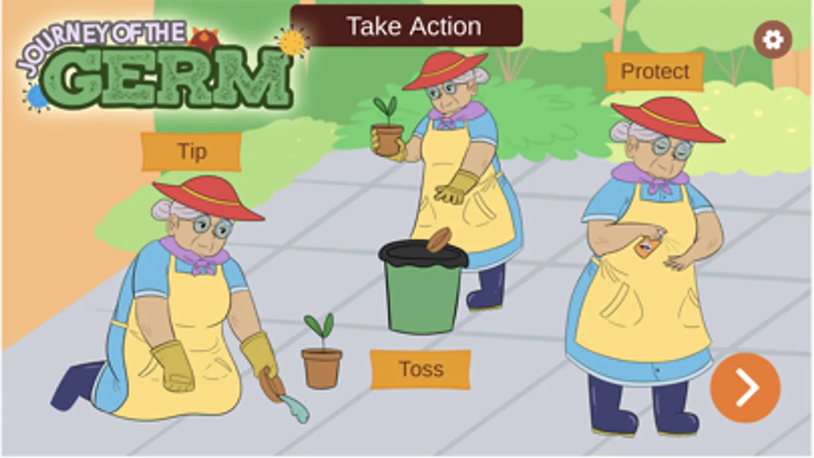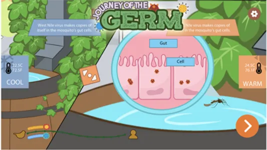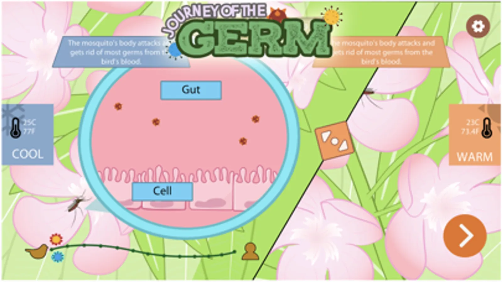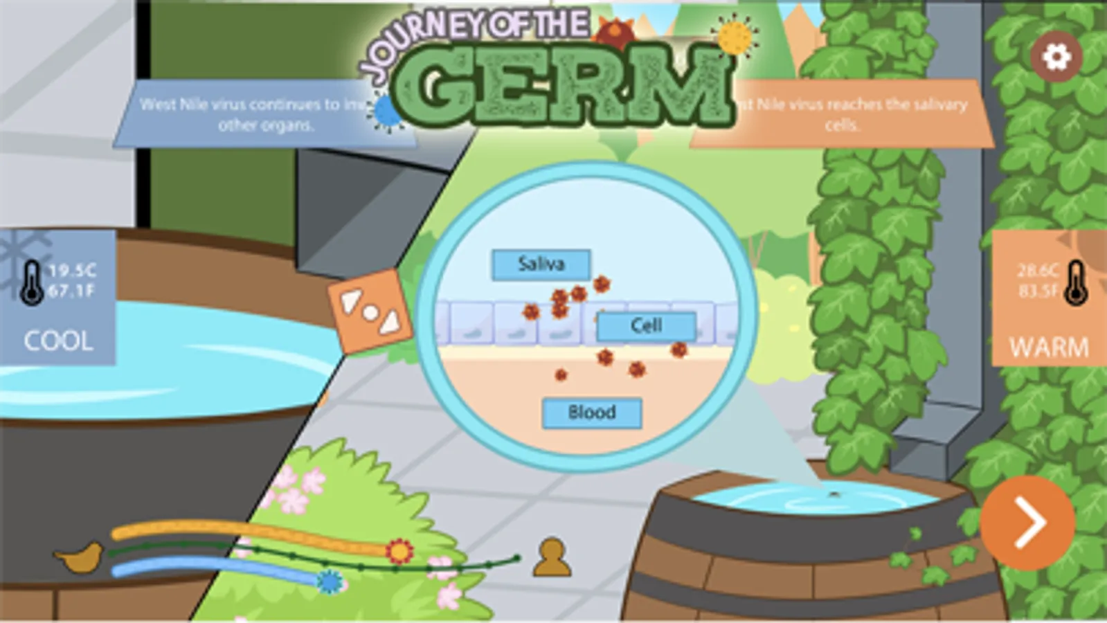 Journey of the Germ is an animated and interactive video that details how West Nile virus is spread from host to host by a mosquito. The experience illustrates the surprising difference a few degrees in temperature can make in the spread of West Nile virus.