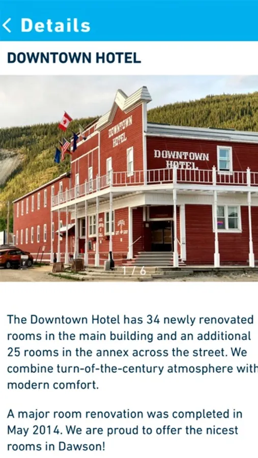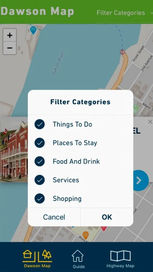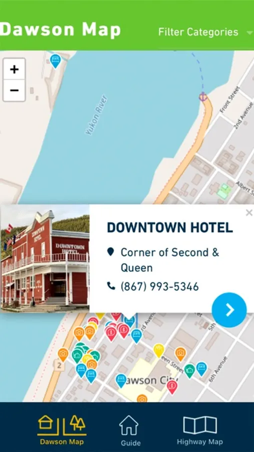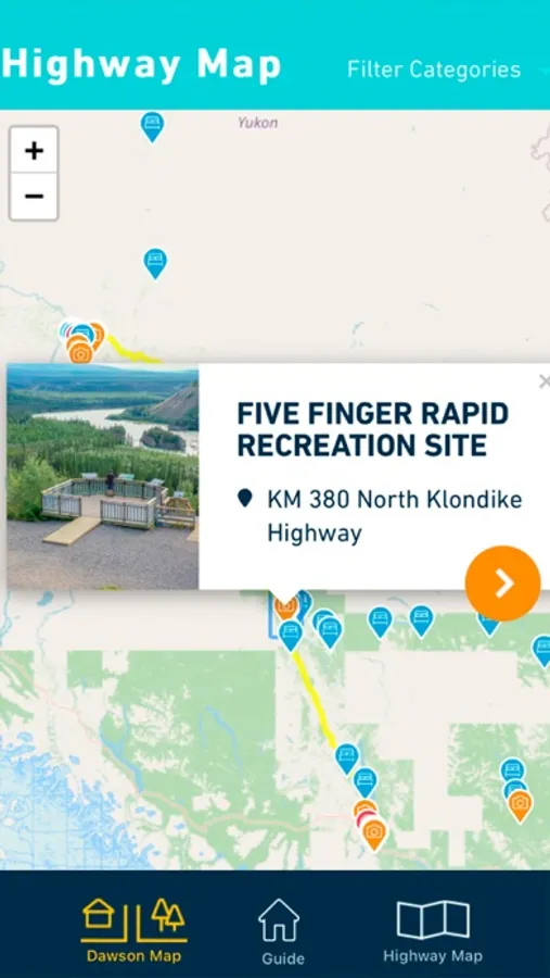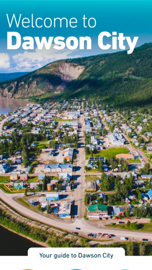 The Dawson map features business locations by category, and the North Klondike highway map includes stops and landmarks along the way.