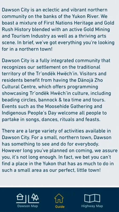 Dawson City is a fully integrated community that recognizes our settlement on the traditional territory of the Tr’ondëk Hwëch’in. Visitors and residents benefit from having the Dänojà Zho Cultural Centre, which offers programming showcasing Tr’ondëk Hwëch’in culture, including beading circles, bannock & tea time and tours. Events such as the Moosehide Gathering and Indigenous People’s Day welcome all people to partake in songs, dances, rituals and feasts.