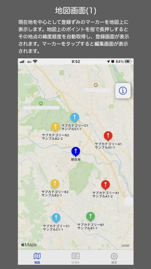 本アプリは、地図にマーカーを設定するアプリです。それぞれのマーカーをカテゴリー/サブカテゴリーに分類できる機能があります。サブカテゴリー毎にマーカーの色を変えたり、表示・非表示を切り替えたりできます。用途に合わせて必要なマーカー表示ができます。