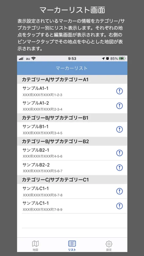 地図画面で表示されている位置情報をカテゴリー/サブカテゴリー別にリスト表示します。表示された位置情報をタップするとマーカー編集画面が表示されます。右側のピンマークをタップするとその位置を中心とした地図が表示されます。