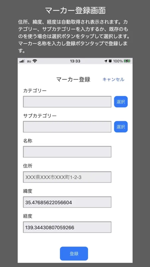 ・マーカー登録画面では、地図上で長押しした位置の緯度経度が自動的に表示され、それに対応する住所も自動的に表示されます。住所は必要に応じて編集してください。カテゴリーとサブカテゴリーは入力欄に入力するか、「選択」ボタンをタップして既に登録済みの項目を選択します。マーカー名称は必ず入力してください。「登録」ボタンタップで登録します。