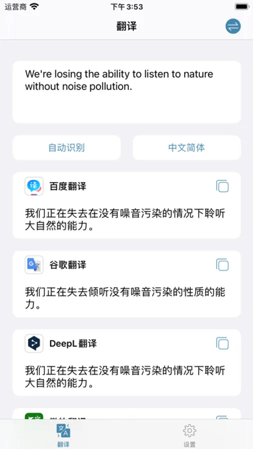 在翻译句子时,常常会发现每家翻译引擎的翻译结果都不一样,于是我们开发了此应用,聚合各大翻译引擎,一次输入即可获取多个翻译结果,方便大家对比。本应用当前整合的翻译引擎包括:百度翻译、有道翻译、腾讯翻译、搜狗翻译、彩云小译、谷歌翻译、DeepL翻译、微软翻译。另外我们还提供离线翻译引擎,无需联网也能翻译句子,但离线翻译的效果不如在线翻译引擎。