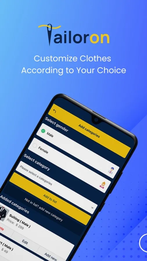 This app introduces an easy to use and affordable online dress designing feature for modern online bespoke tailoring mobile app. Using our app the admin can add options for various design styles for each customizer and users can design and customize their clothes by selecting different design patterns as they get the freedom to choose every component that goes into tailoring your outfit. Once the order is completed, the user will get an email notification.