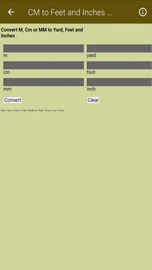 Simple no frills tool to help convert units of meter, centimeters, millimeters to yard, feet and inches.