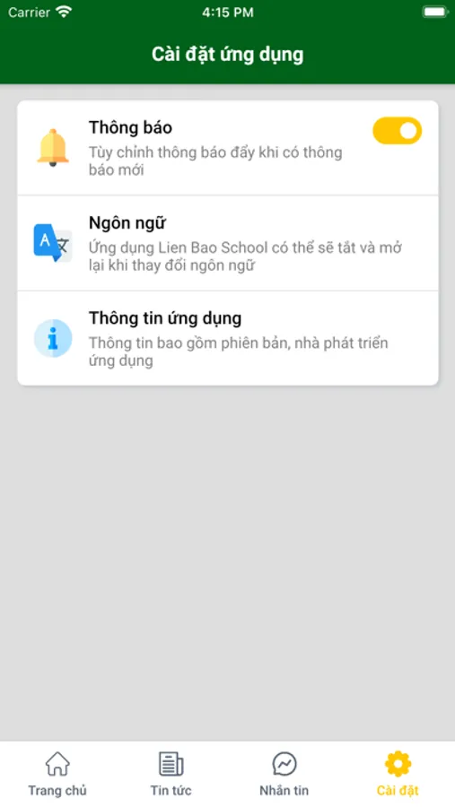 - Nhận thông báo từ giáo viên và nhà trường về lịch học, sự kiện, thông tin liên hệ...