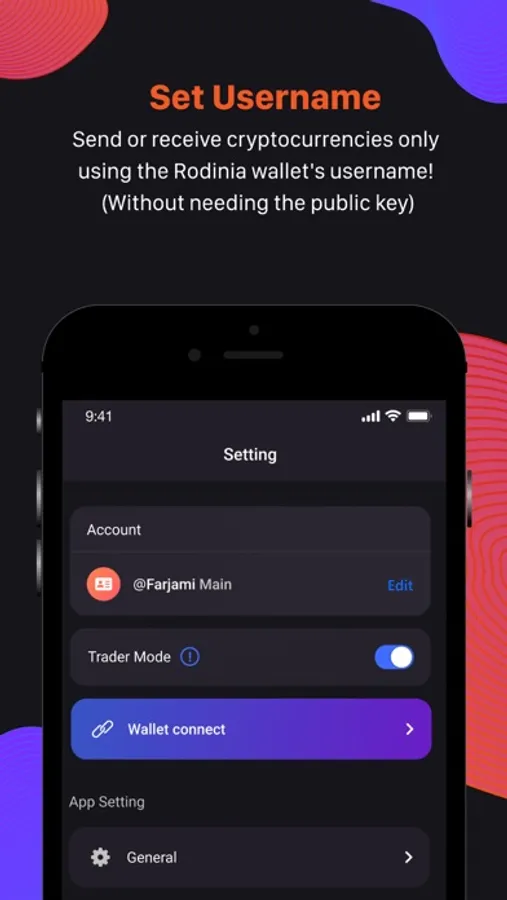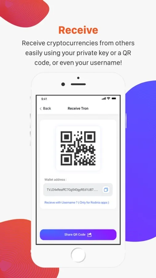 You can send or receive cryptocurrencies only using the Rodinia wallet's username! (Without needing the public key)