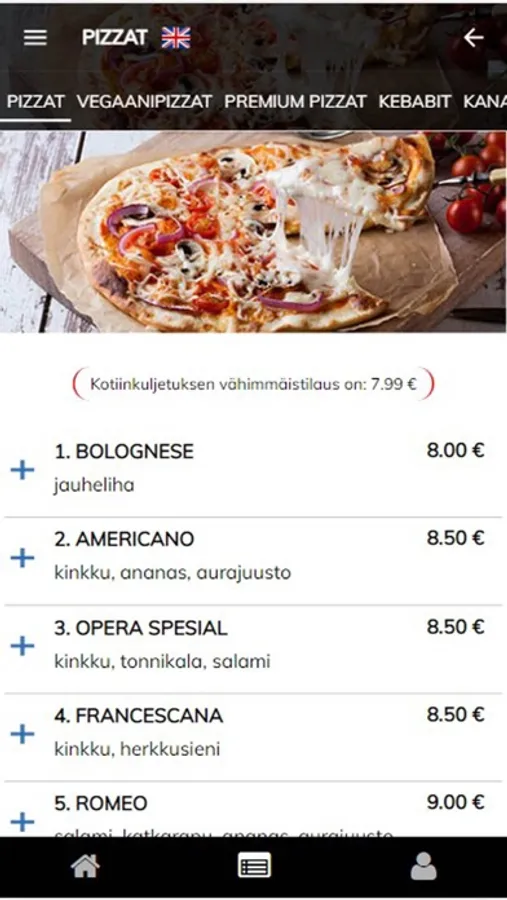 pizzat suoraan listasta, erilaiset valkosipulileivät tai extratäytteet ja annoksen kylkeen valittava juoma – tai