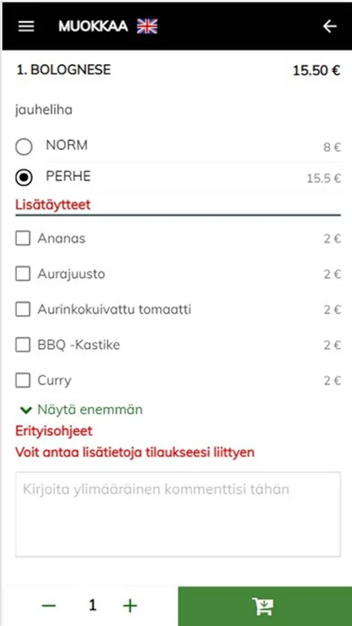 Valittuasi halutun ruoka-annoksen, lisäät sen ostoskoriin – tai valitset esim. lisätäytteitä. Voit tehdä vielä