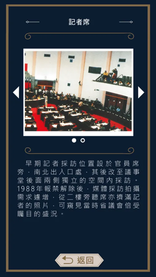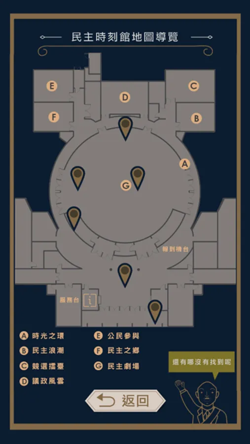 此程式應用於民主時刻館現場,提供民眾數位化導覽服務。 下載APP後可利用個人行動裝置掃描,AR辨識海報識別圖像進行數位導覽服務。
