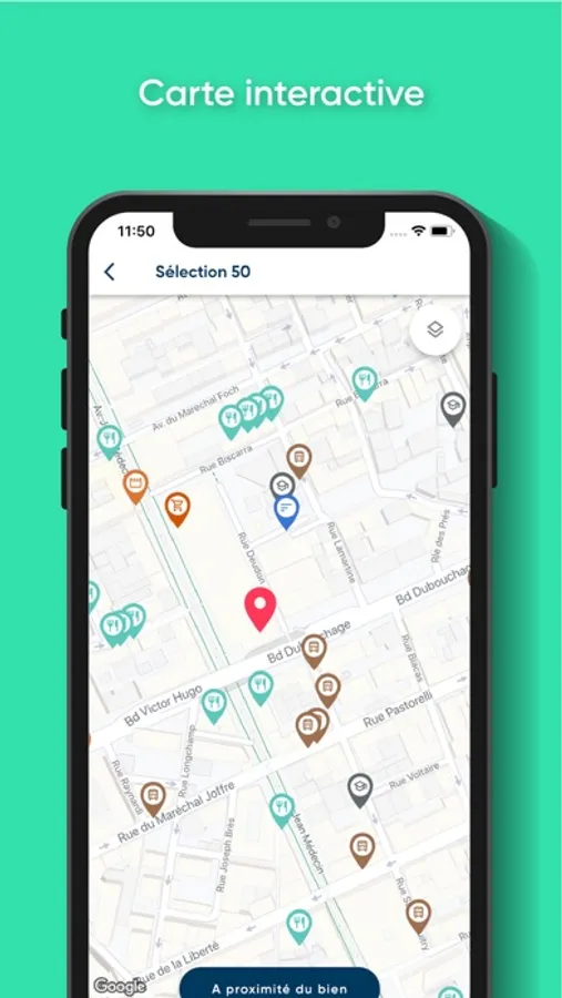 Retrouvez vos biens géolocalisés sur une carte interactive et visualisez votre futur quartier : transports, commerces, services, établissements scolaires à proximité.
