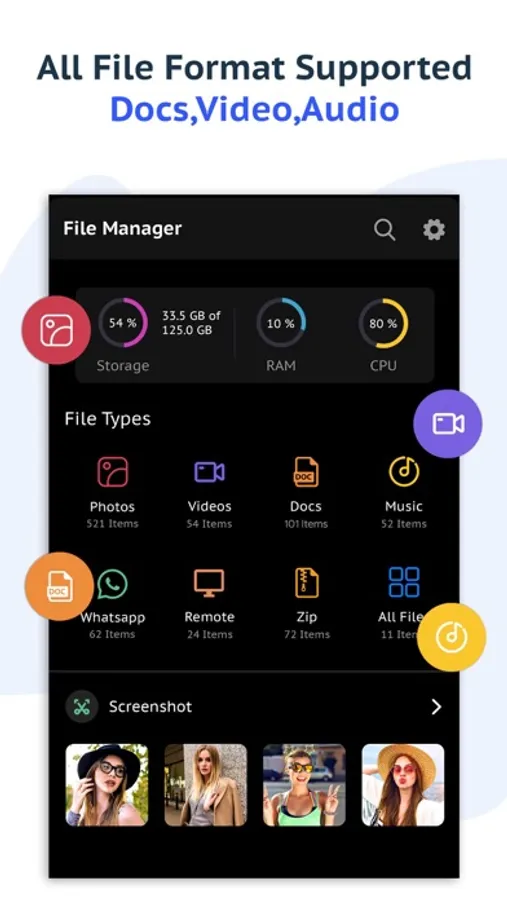 - Categories: Files are organized into categories by their formats. From there, you can access to frequently used apps quickly.