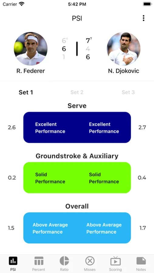 At the core of the app are the three indexes that ultimately bestow the PSI GRADES. Three areas of a player’s performance are graded within each designated Index; SERVICE PERFORMANCE, GROUNDSTROKE AND AUXILIARY, and OVERALL PERFORMANCE. All areas consist of uniformed parameters of Good Shot/Bad Shot point averages that make up each Index established through years of research of charting competitive matches at all levels of the game.