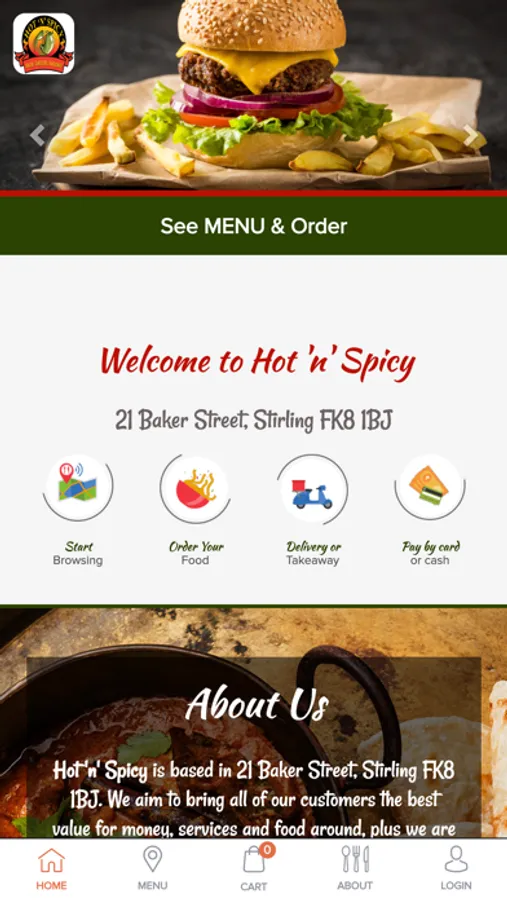 Hot 'n' Spicy is based at 21 Baker Street, Stirling FK8 1BJ. We aim to bring all of our customers the best value for money, services and food around, plus we are constantly aiming to improve our service in Stirling. You can now order food online. Try our online website which contains all our menus. We offer deliveries to all surrounding areas of Stirling. We offer all our customers fast food delivery. You can now order your favourite dish online and get fast home delivery. We are very particular about our service and quality to give our customers a better experience; which is why we are now proud to offer this fantastic online ordering website. You can even pay online and get your food delivered to your home in Stirling.