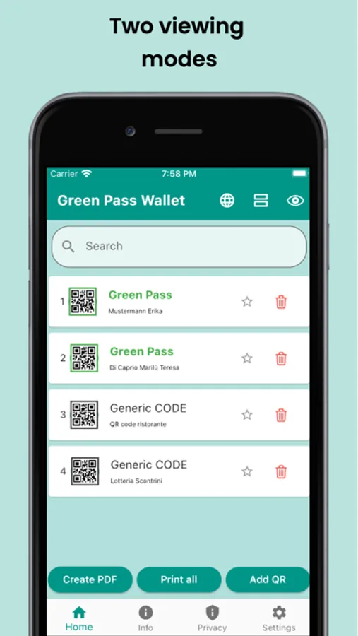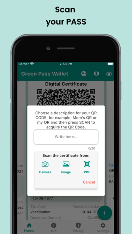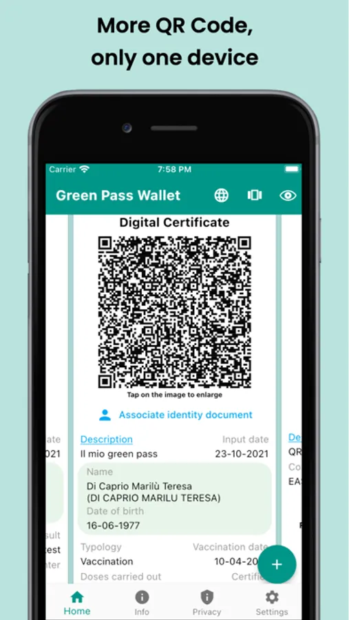 Swally allows easy and safe storage of your Green Pass and that of your loved ones and is the only application that allows you to associate an identity document or a generic document with each Green Pass.