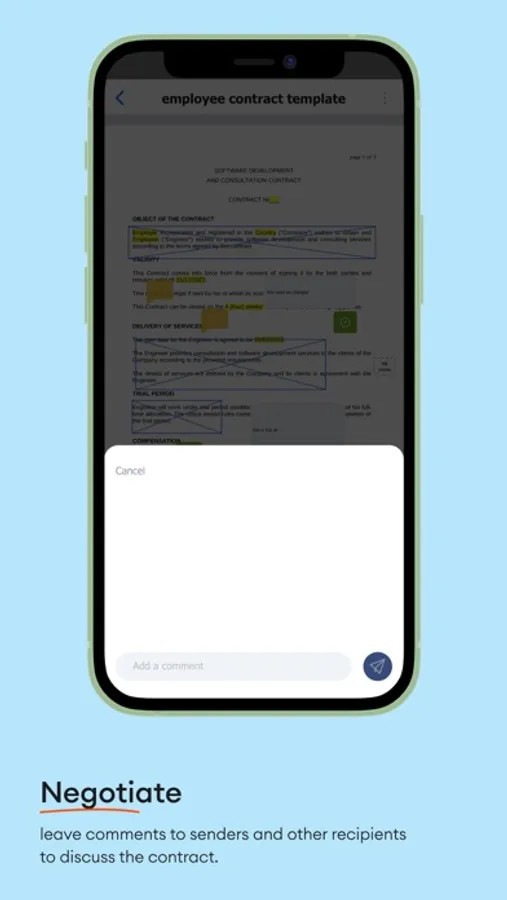 - Carry out edits, comments, inset text, and strikethroughs directly within your contract.