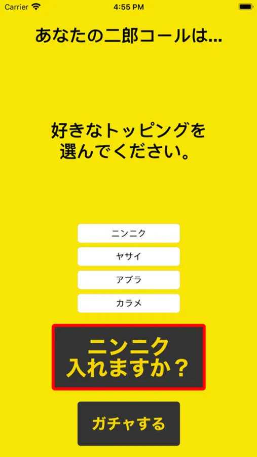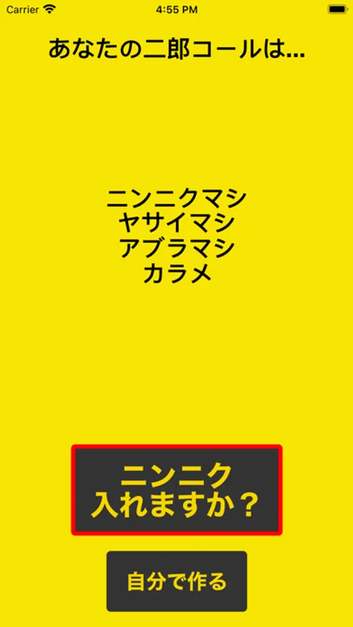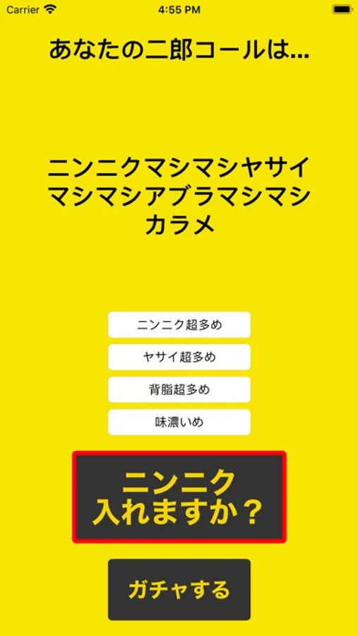 「ニンニク入れますか?」ボタンを押すと、200通りの中から、ランダムにコールを表示します。