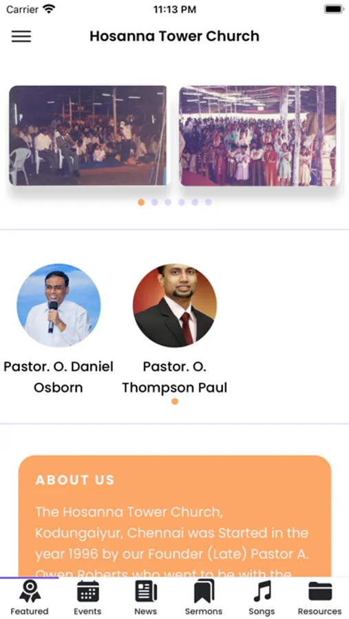 The Hosanna Tower Church, Kodungaiyur, Chennai was Started in the year 1996 by our Founder (Late) Pastor A. Owen Roberts who went to be with the Lord in the year 2010 after completing nearly 50 years of fruitful ministry.The Church is currently led by Pastor O. Daniel Osborn and Pastor O. Thompson Paul Go forth, sons of Pastor A. Owen Roberts.We are a multilingual Church with Services in Tamil, English and Hindi.