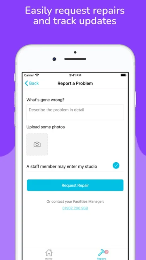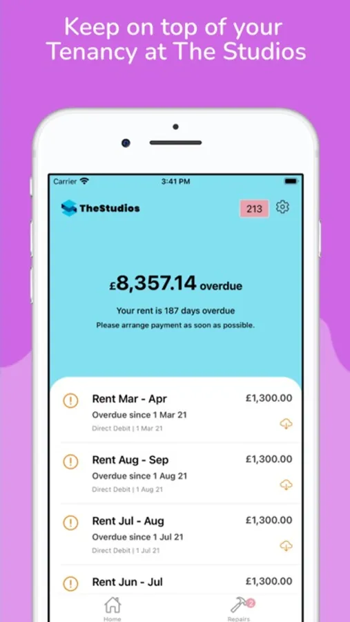 Get realtime information on your residency at The Studios serviced accommodation in Wolverhampton, UK, including invoice statuses, PDF downloads and a notification when an invoice is about to become due. You can also request repairs for your studio direct from the app, and get realtime notifications as the repair is scheduled and completed.