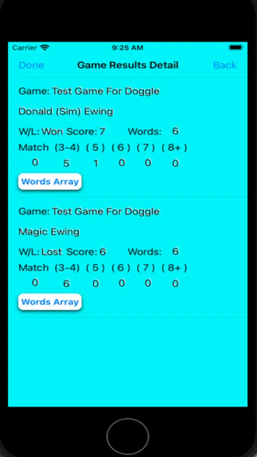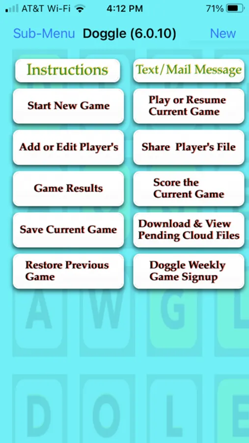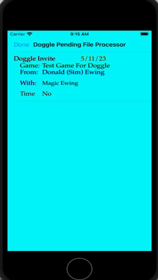 For each game there is an “Owner” (initiator)and “Players” (invitee). The Owner is responsible for setting the parameters for the game, creating the “Doggle Board” and inviting the players to the game and at the completion of the game scoring the game results and distributing the results to the players. The Players have the responsibility to send their scores to the Owner. These files are automatically sent to the proper player(s) via iCloud.
