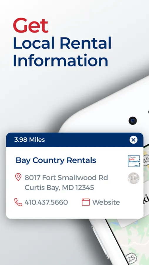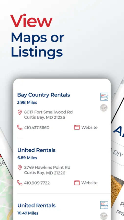 Location-based search results deliver a list of local American Rental Association-member rental partners carrying the equipment with contact information for each store.