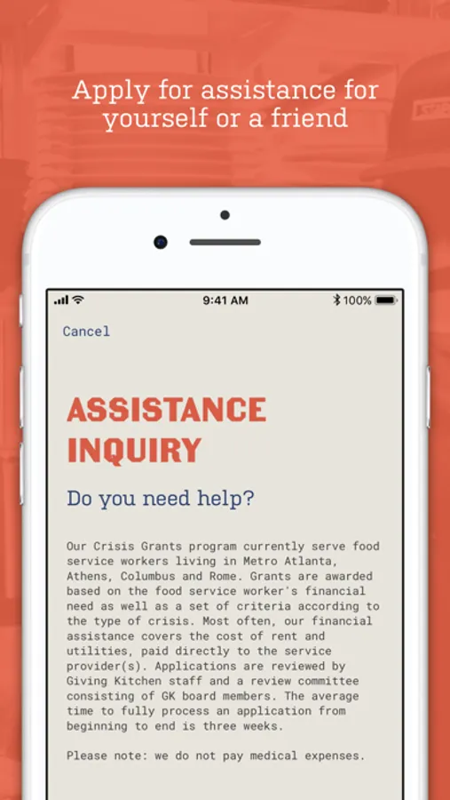 Our financial assistance program currently serves food service workers in Georgia and Tennessee. Financial assistance is awarded based on the food service worker’s financial need as well as a set of criteria according to the type of crisis.