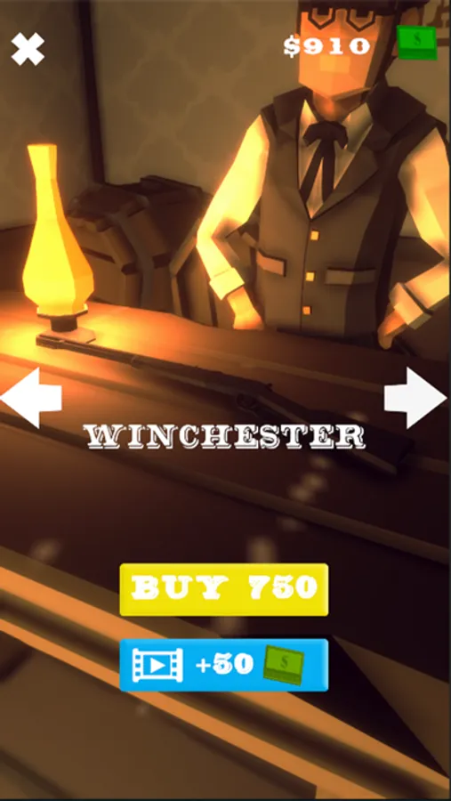 Unlock new weapons through gun shop. Gun shop offers various weapons such as revolvers, shotguns, and rifles.