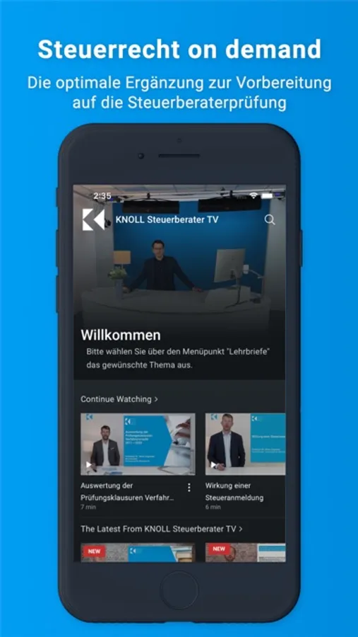 Die KNOLL STB TV App ermöglicht Ihnen jederzeit Zugriff auf alle Videos aus dem Kurs „Fernunterricht zur Vorbereitung auf die Steuerberaterprüfung“ des Steuerrechts-Instituts KNOLL. Die Kurzvideos erläutern examensrelevante Lerninhalte aus den einzelnen Lehrbriefen und eignen sich damit optimal als Ergänzung zur Vorbereitung auf die Steuerberaterprüfung (STB-Examen).