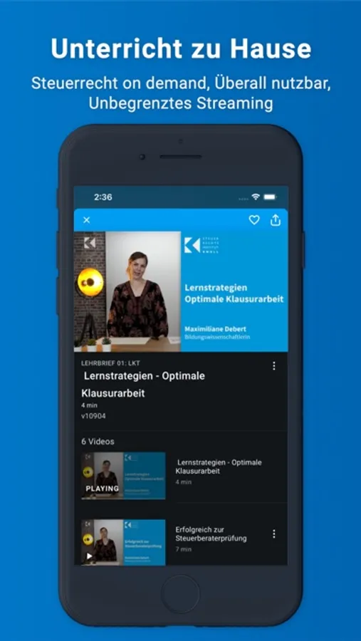 Die Videos in HD können zum Lernen und Wiederholen am iPhone, iPad und über Apple TV wiedergegeben werden. Mit der intuitiven und modernen App haben Sie auch Zugriff auf die intelligente Suche, mit der sich Fachbegriffe in Videos schnell finden lassen. Dank der regelmäßigen Video-Updates aus dem hauseigenen Produktionsstudio bleiben Sie immer auf dem aktuellen Stand.