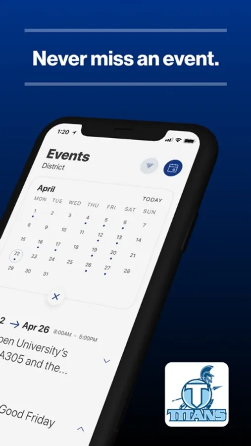 The event section shows a list of events throughout the district. Users can add an event to your calendar to share the event with friends and family with one tap.